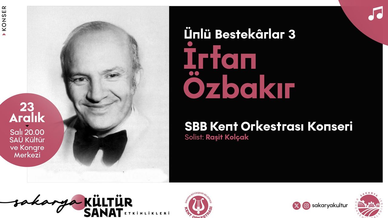 Sanat dolu günün akşamında ise müzikseverler unutulmaz bir konserle buluşacak. ‘Ünlü Bestekârlar – İrfan Özbakır’ temasıyla düzenlenen SBB Kent Orkestrası Konseri, saat 20.00’de SAÜ Kültür ve Kongre Merkezi’nde gerçekleştirilecek. Konserde orkestraya solist olarak Raşit Kolçak eşlik edecek.