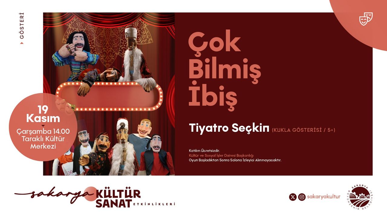 Tiyatro Seçkin’in hazırladığı “Çok Bilmiş İbiş” kukla oyunu saat 14.00’da Taraklı Kültür Merkezi’nde ücretsiz olarak sahnelenecek. 5 yaş ve üzeri çocuklara hitap eden oyun miniklere keyifli bir deneyim sunacak.