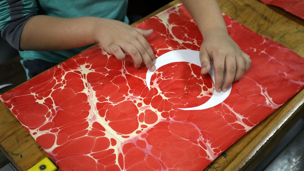 Öğrenciler ebru sanatıyla Türk bayrağı yaptı
