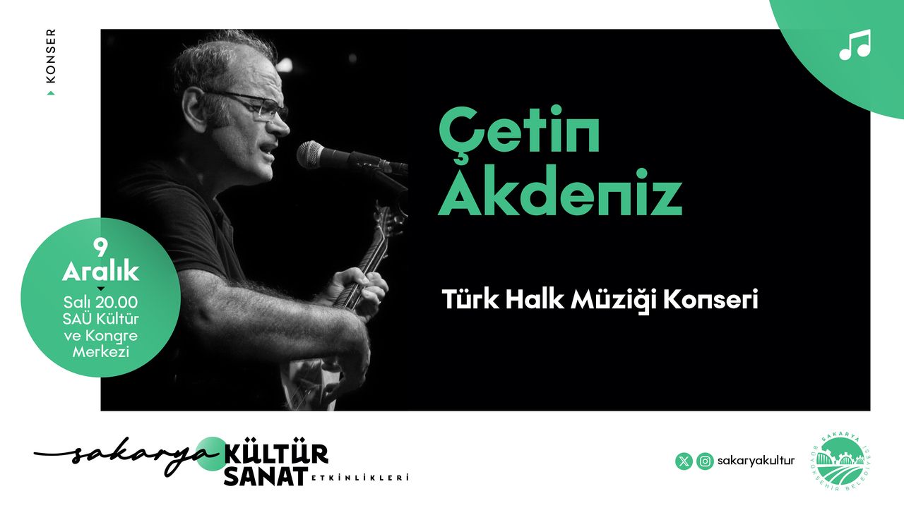 9 Aralık Salı günü düzenlenecek konserde Anadolu’nun zengin ezgilerini sazıyla ve özgün yorumuyla buluşturan Çetin Akdeniz sahne alacak. SAÜ Kültür ve Kongre Merkezi’nde gerçekleşecek konserde usta sanatçı Akdeniz, Türk halk müziğinin seçkin eserleri seslendirilecek. Konser saat 20.00’da başlayacak.
