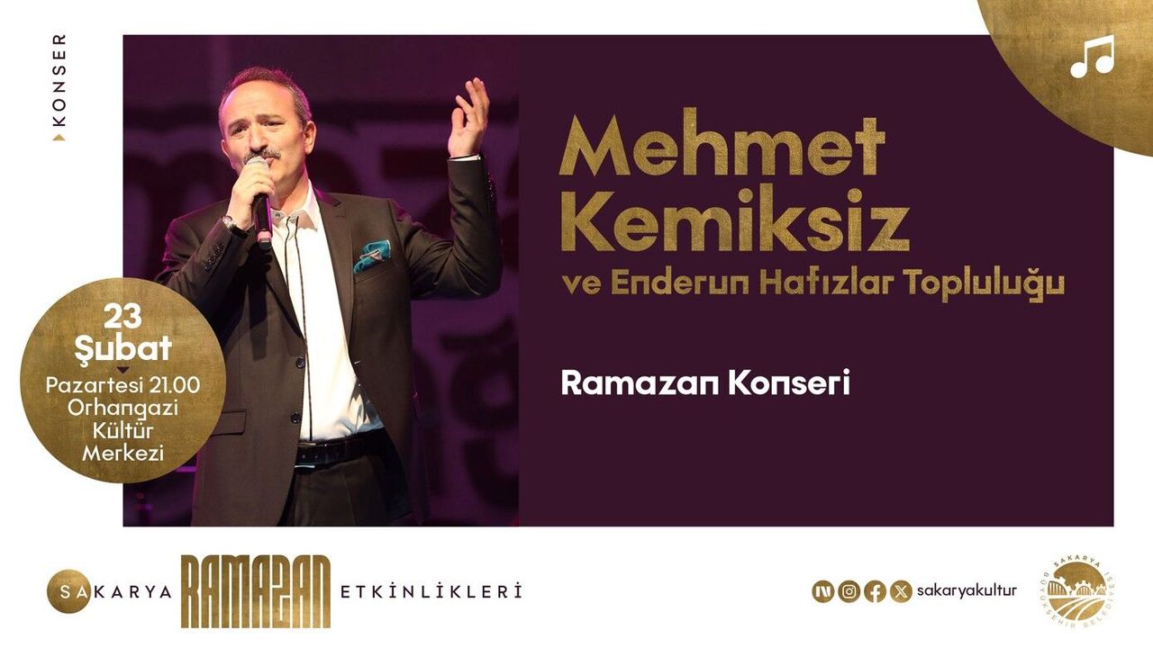 Sakarya Büyükşehir Belediyesi Kültür ve Sosyal İşler Dairesi Başkanlığı tarafından hazırlanan Ramazan Kültür Sanat Takvimi, haftaya anlamlı bir konserle başlıyor. Bu kapsamda 23 Şubat Pazartesi günü sevilen sanatçı Mehmet Kemiksiz Sakaryalılarla buluşacak.
