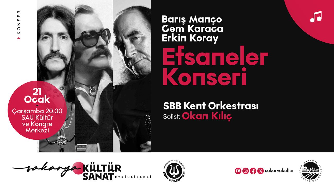 Sakarya Büyükşehir Belediyesi, Ocak kültür sanat etkinlikleri kapsamında 21 Ocak Çarşamba günü saat 20.00’de SAÜ Kültür ve Kongre Merkezi’nde Türk rock müziğine damga vuran Barış Manço, Cem Karaca ve Erkin Koray’ı, unutulmaz şarkılarıyla anacağı özel bir konser düzenliyor.