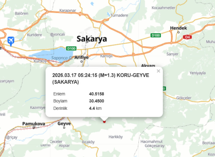 Saat 05.24’te kaydedilen depremin büyüklüğü 1.3 olarak ölçülürken, yerin 4.4 kilometre derinliğinde gerçekleştiği bildirildi. Depremin merkez üssü Koru-Geyve olarak açıklanırken, sarsıntının çevre yerleşimlerde hissedilmediği öğrenildi.