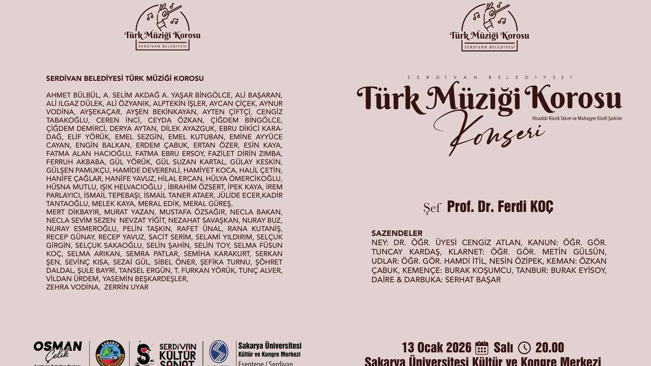 Serdivan Belediyesi Türk Müziği Korosu, 13 Ocak 2026 Salı günü gerçekleştireceği büyük konser için son provalarını tamamlayarak geri sayıma başladı. Şefliğini Prof. Dr. Ferdi Koç’un üstlendiği bu özel etkinlik, Sakarya Üniversitesi Kültür ve Kongre Merkezi’nde saat 20.00’de sanatseverlerle buluşacak. “Hicazkâr Klasik Takım ve Muhayyer Kürdî Şarkılar” temasıyla hazırlanan konser, Türk musikisinin en seçkin örneklerini dinleyicilere sunarak Serdivan’da unutulmaz bir müzik akşamı yaşatmayı hedefliyor.