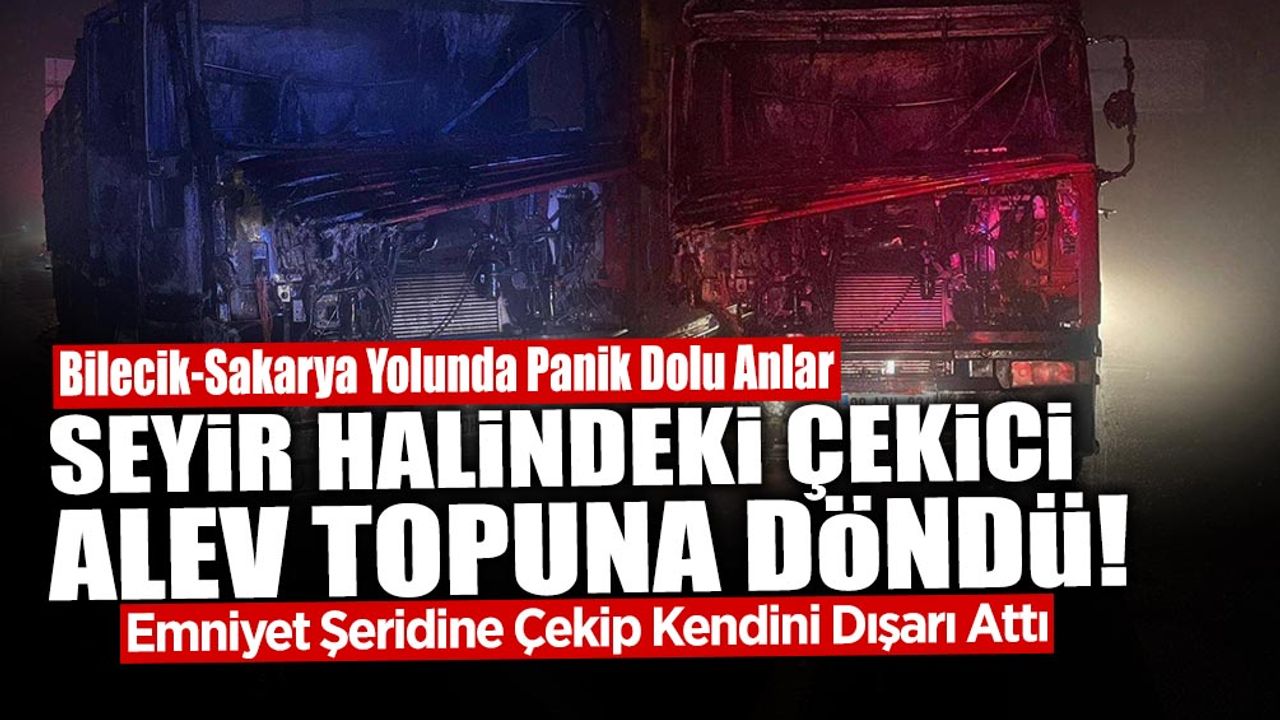 Murat E. (48) yönetimindeki 09 ADH 934 plakalı çekici, Bilecik-Sakarya kara yolunun Kızılöz mevkisinde henüz belirlenemeyen nedenle sigorta kısmında yanmaya başladı.