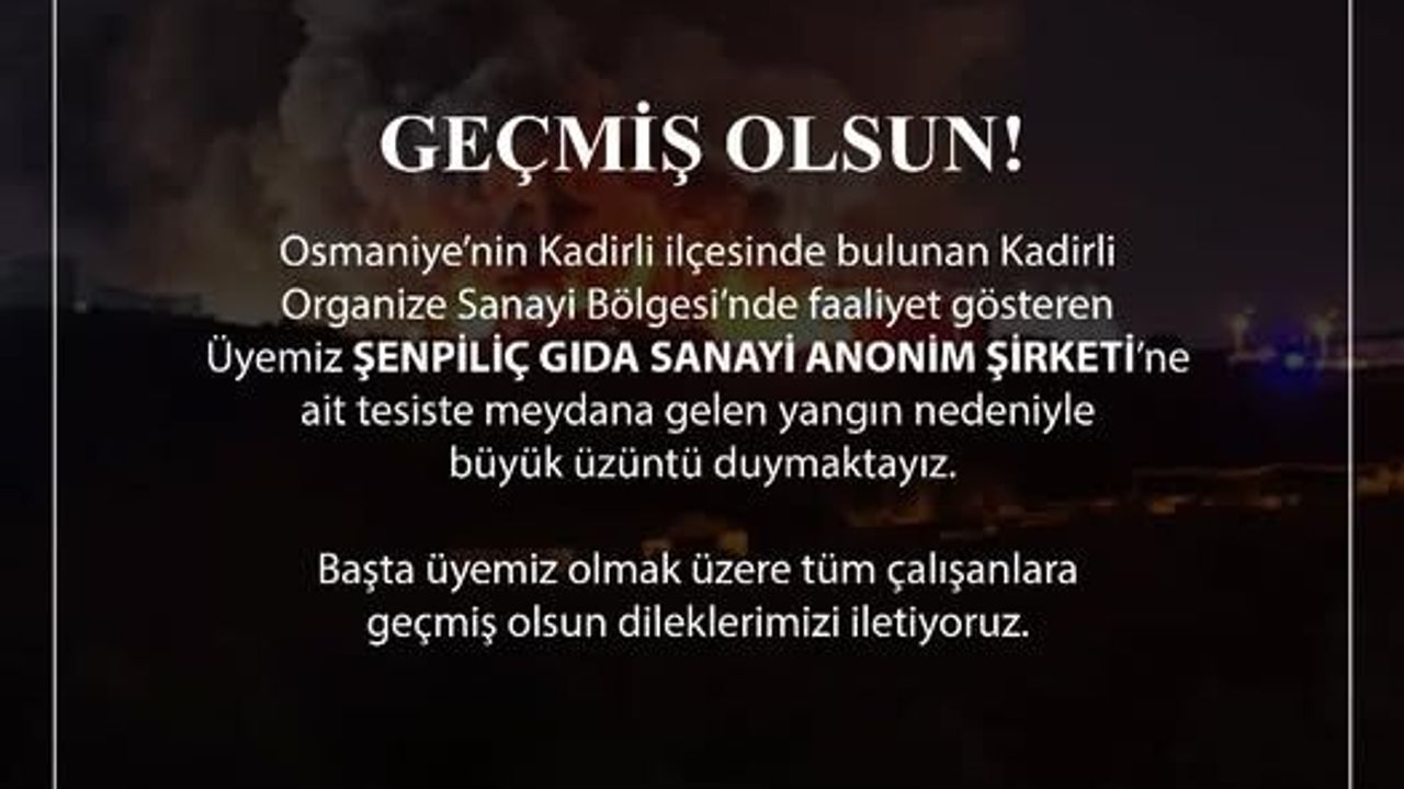 “Osmaniye’nin Kadirli ilçesinde bulunan Kadirli Organize Sanayi Bölgesi’nde faaliyet gösteren üyemiz Şenpiliç Gıda Sanayi Anonim Şirketi’ne ait tesiste meydana gelen yangın nedeniyle büyük üzüntü duymaktayız. Başta üyemiz olmak üzere tüm çalışanlara geçmiş olsun dileklerimizi iletiyoruz.”